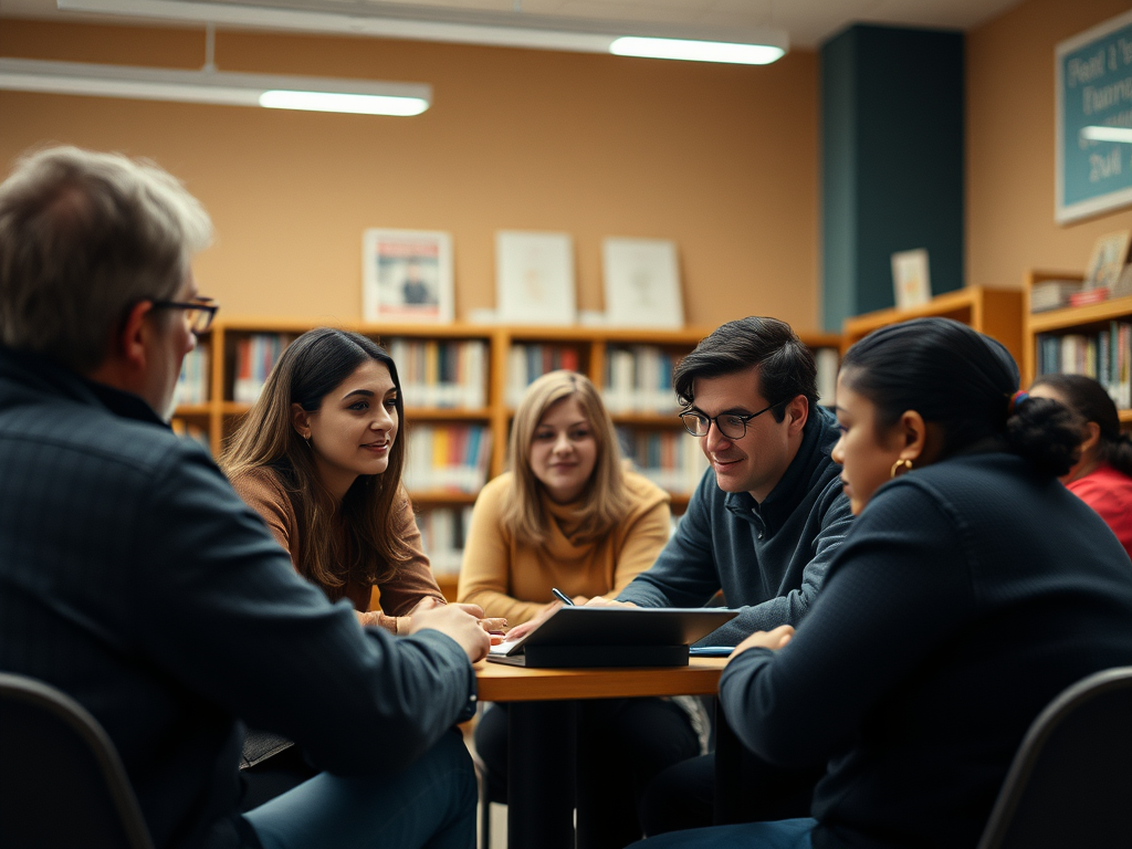 AI Generated Image: “Parents participating in a workshop provided by the school librarian. The workshop is at the school library.”